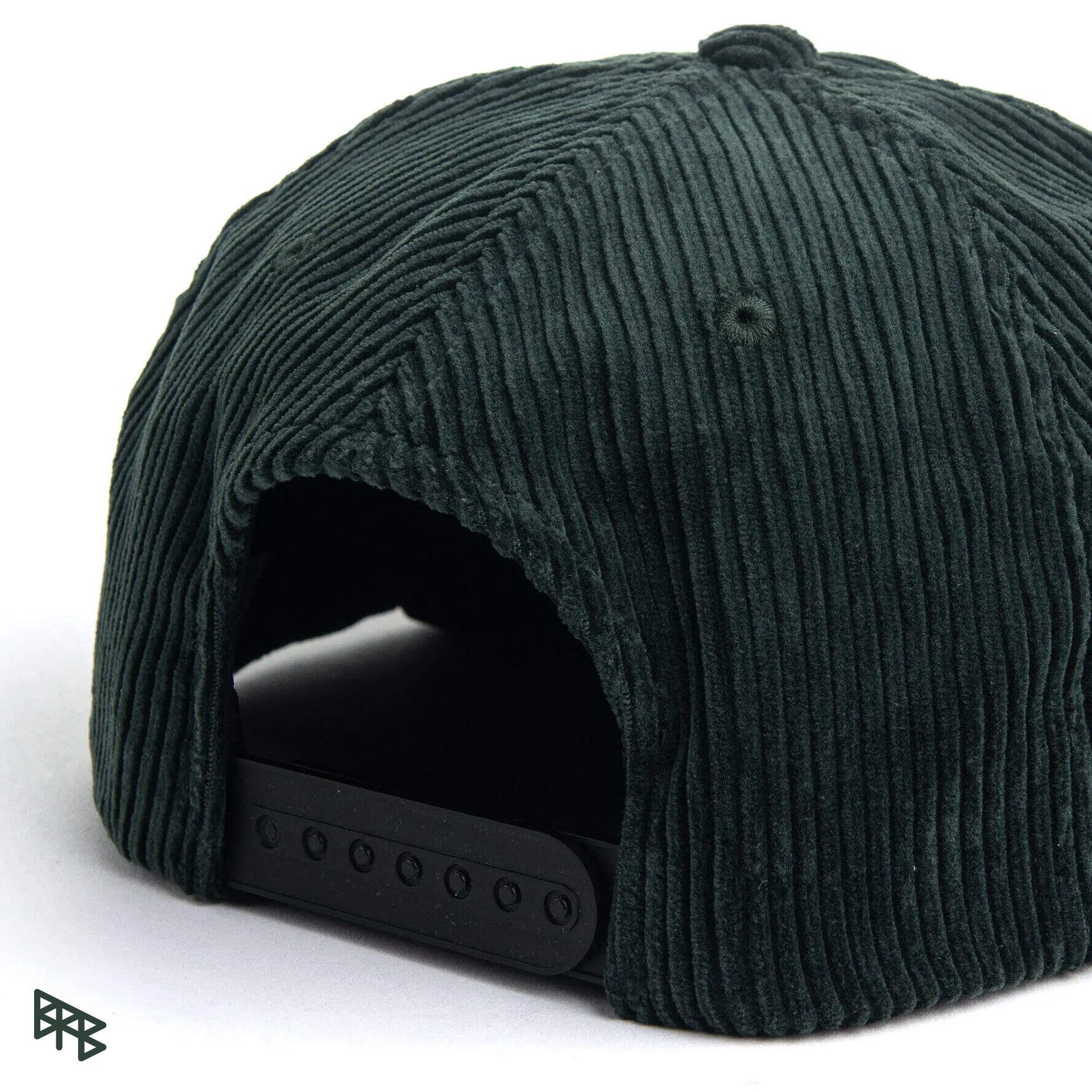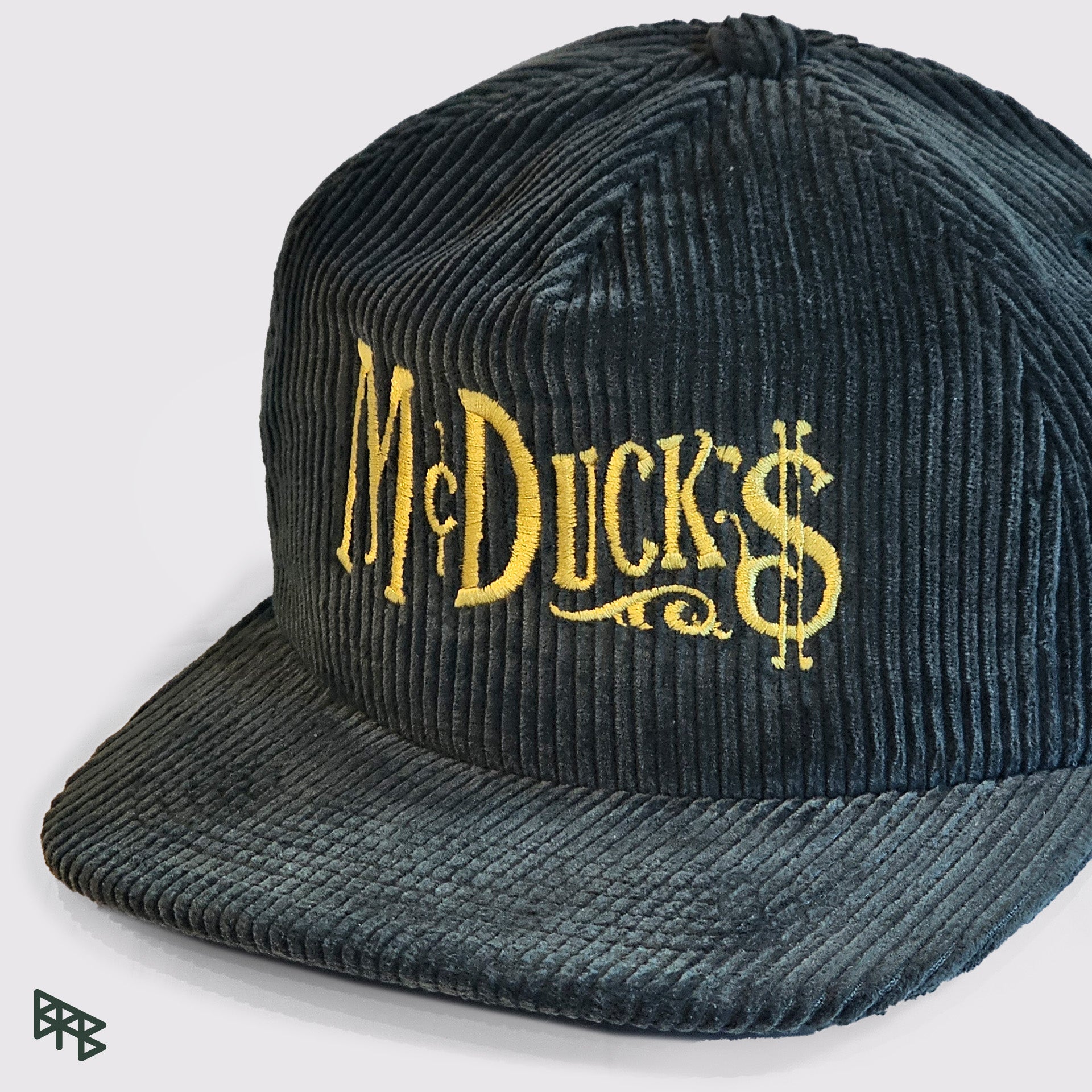 McDucks snapback cap in corduroy fabric with metallic gold stitching.